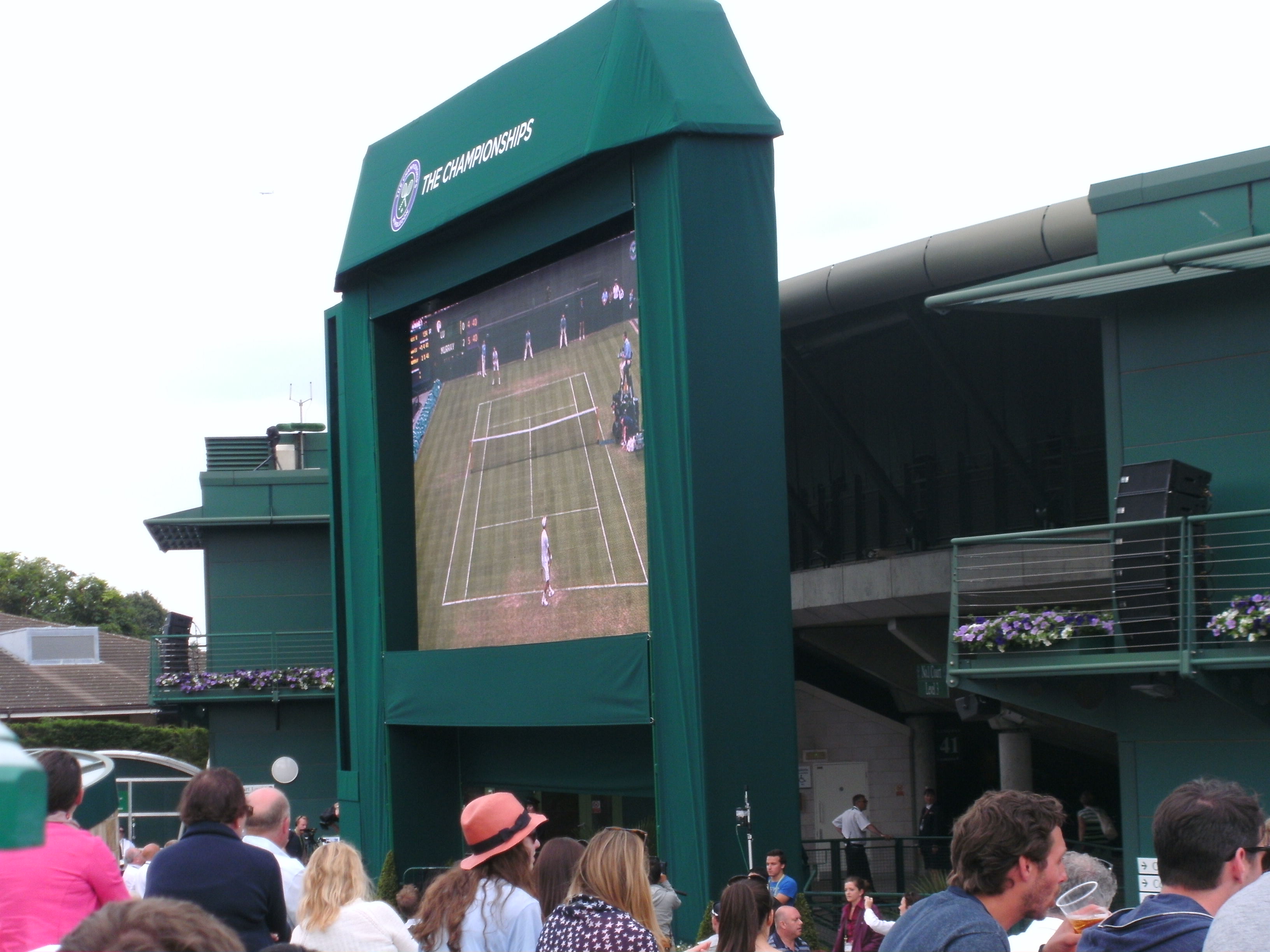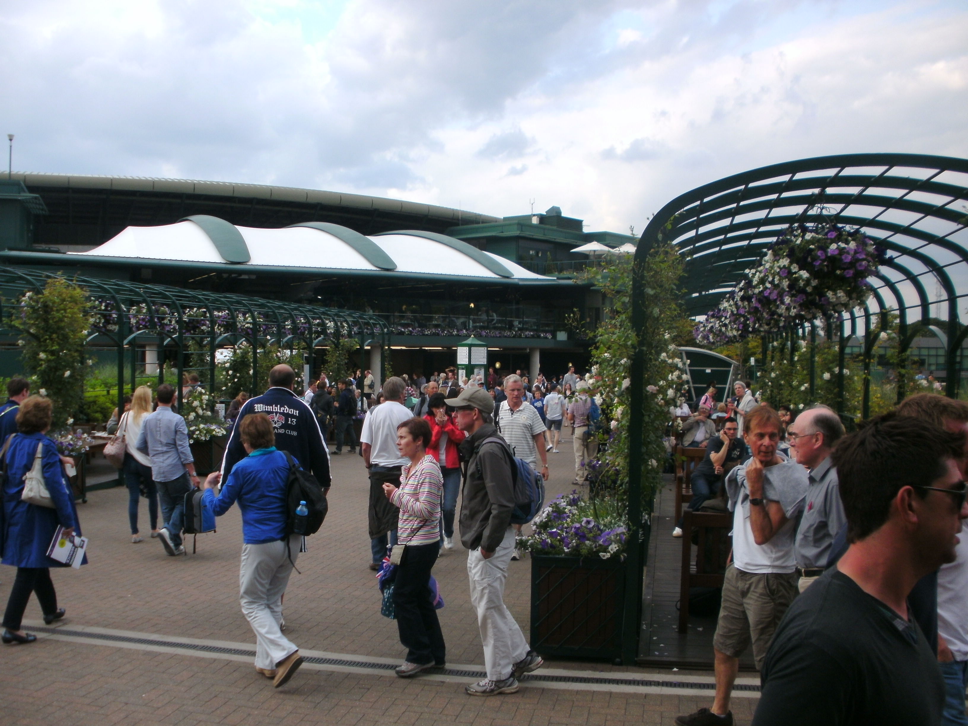 So after the debacle of getting in, we were now entering after 5pm so the cost reduced from £20 each to £14. It’s one of the premier sporting events in the world and ordinary people can still get in on the day: marvellous. The place is deceptively larger than it appears on TV, and extremely crowded. I’m led to believe the grounds can hold 14000 people, I don’t doubt it. We looked around some of the lesser courts and there are seats available, you just walk in and watch. The ‘show’ courts, i.e. Centre, No’s 1, 2, 3, 4 need previously bought tickets, or you can queue up at the returns office and buy a show court ticket for £5. This is a good system, where people hand in their £50 tickets when they don’t want to see any more tennis, and ground entry viewers can buy one and get into a show court. Its a good way of spreading it about. As it happens my girls got given two No 1 court tickets, by two nice ladies they got chatting to on Henman Hill. This is the only place you can see the tennis if you are not in a show court. It’s nearly always crowded as well.