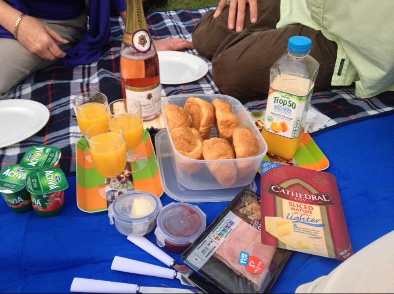 So we joined the queue and to be fair to the ‘Honorary Stewards’ who patrol Wimbledon park and organise the queue, they were to a man (and woman) even tempered and actually quite charming, always willing to stop and chat and answer your questions. It reminded me of my Olympic experience in which we were taught to be the same ( see July/August 2012 of this blog). So we settled down with a picnic blanket, and broke out the bubbly: pink rose, croissants, jam, ham and cheese, looking like this: