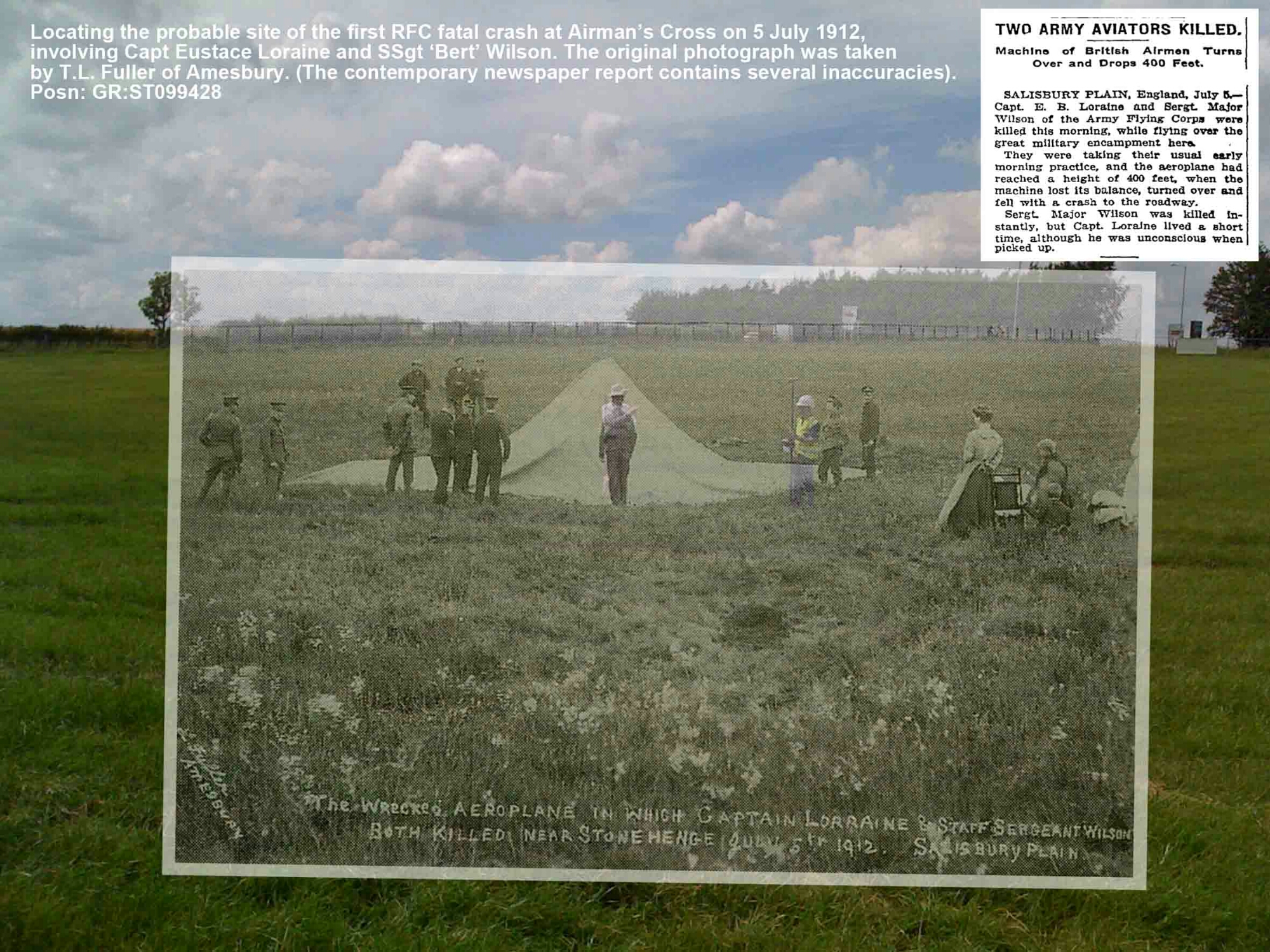 On 5th July 1912, Captain Eustace Laraine and Staff Sgt Richard Wilson were flying in their Nieuport monoplane having taken off from Larkhill air station, when the pilot executed a steep turn and crashed killing both crew. The crash site is adjacent to the new visitor centre at Stonehenge: