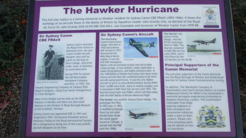 Yes, yes I know its where the Queen lives (some of the time) but it’s also where my wife was born and raised and where we got married, but more of that later. We go there a couple of times a year, it’s not far and it’s magical at Christmas. This was a sunny early day, on the cusp of changing the clocks to urgh time. I say that because I HATE when the clocks go back, so depressing when it gets dark at 4.00pm. Any way I digress, generally we go to Windsor for the shops and the ambience despite the presence of tourists from well, everywhere really. I heard and saw many Japanese, German, Mexican, Chinese et al. The Americans are the funniest though; everyone must have heard at least one Yank saying: why did they build the castle so near the airport? Anyway on this occasion we just wanted to walk along the river, but first job is to find somewhere to park. It’s always been a problem in the town, especially on Saturdays, but we found someone waiting to get out in the station car park, and as an added bonus the driver offered me his ticket, valid until 23:59 that day (that’s one minute to midnight in non-24 clock speak), so that was free then. We strolled down past Eton Bridge and down to French Brothers boat trips. A trip down the river was suggested so we bought senior tickets (75pence reduction) for the 40 minute trip down to Boveney lock and back. Which brings me to the crux of this diatribe: The Hawker Hurricane, world war 2 fighter aircraft, of which the boat commentary mentions that a full sized replica of said aircraft is on the side of the river and is a tribute to Sir Sydney Camm, famous aircraft designer who was born and went to school in Windsor: